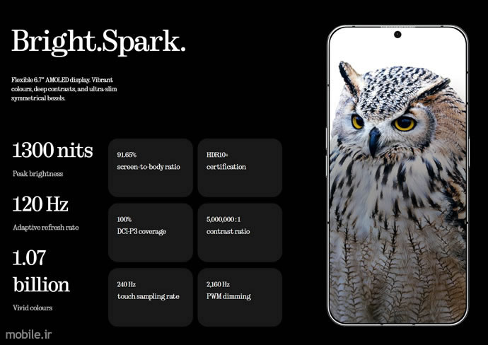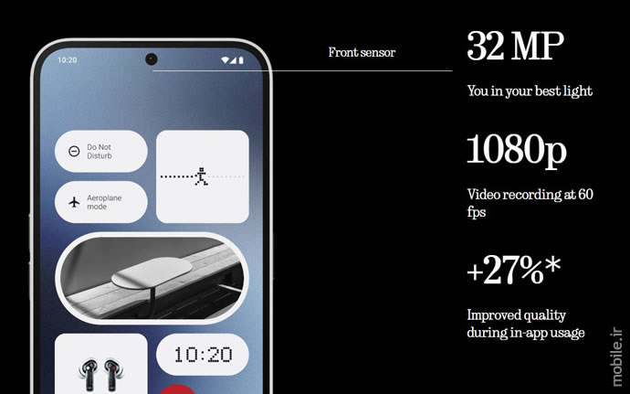 روشنایی متوسط و بیشیشه اتوماتیک این پنل بهترتیب 700 و 1,100 نیت بوده روشنایی نقطهای آن نیز تا 1,300 نیت قابل افزایش است که این آخری نسبت به روشنایی نقطهای 1,600 نیت در Phone (2) با کاهش روبرو شده است. کنتراست 5,000,000:1، سرعت برداشت تاچ حداکثر 240 هرتزی، کاهش نور 2,160 هرتزی PWM و نمایش محتوای +HDR10 سایر مشخصات این پنل را تشکل میدهند. سنسور اثر انگشت نوری درون همین صفحهنمایش جای دارد و در مرکز بخش بالایی نیز به دوربین سلفی 32 مگاپیکسلی گوشی برمیخوریم که همان نمونه حاضر در فون 2 بوده و در غیاب فوکوس خودکار همچنان از برداشت ویدئوی 1080p/60fps پشتیبانی میکند.