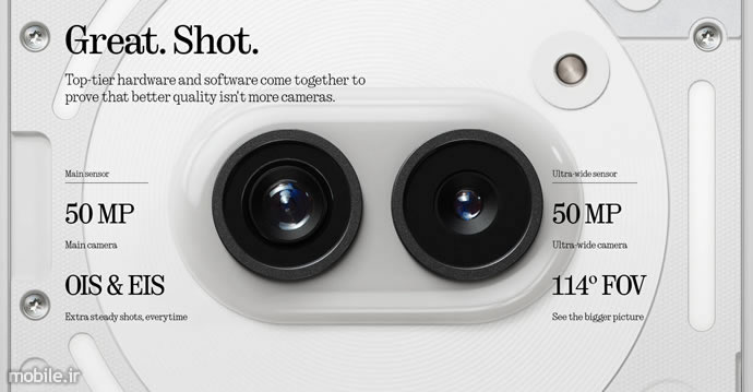 در بخش پشتی Nothing Phone (2a) همانطور که اشاره شد بهسبک دو مدل قبلی این خانواده از دو دوربین 50 مگاپیکسلی استفاده شده که یکی در نقش دوربین اصلی و واید و دیگری دوربین اولتراواید ظاهر میشود. سنسور 1/1.56 اینچی دوربین اصلی دستگاه از نظر اندازه تفاوتی با حسگر دوربین اصلی Phone 2 ندارد اما شرکت سازنده به نوع این سنسور اشارهای نکرده است. در مقابل این حسگر یک لنز f/1.88 (عملاً f/1.9) قرار دارد که این یکی نیز تفاوتی با دوربین اصلی پرچمدار ناتینگ نداشته و حضور OIS نیز شباهت این دو دوربین را تکمیل میکند. دوربین 50 مگاپیکسلی اولتراواید گوشی همان دوربین حاضر در Phone 2 است با این تفاوت که فوکوس خودکار از آن حذف شده و بهجز برداشت عکس با میدان دید گسترده 114 درجهای کارکرد دیگری را ارائه نمیکند.