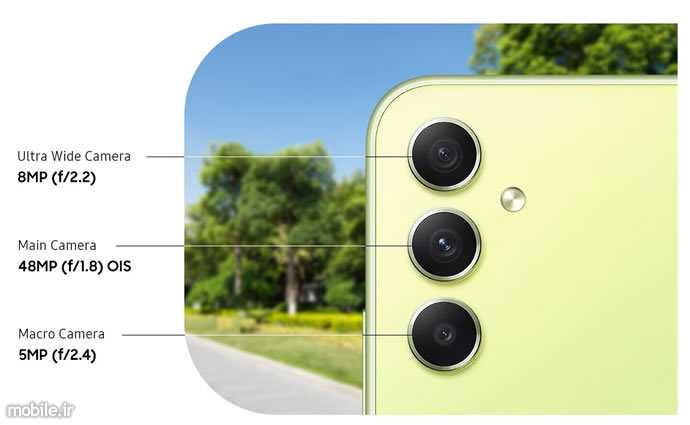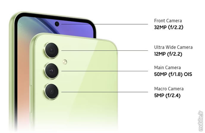 بدنه پشتی محصولات جدید سامسونگ به طور مشابه دارای سه لنز برجسته و فلاش LED است، اما این دوربین ها از نظر وضوح و عملکرد متفاوت هستند. تنظیمات دوربین سه گانه گلکسی A54 شامل یک مدل 50 مگاپیکسلی با f/1.8، فوکوس خودکار و OIS، یک ماژول 12 مگاپیکسلی فوق عریض با فوکوس ثابت و دیافراگم f/2.2 و در نهایت یک واحد ماکرو 5 مگاپیکسلی با f/2.4 است. . شامل می شود. یک دوربین سلفی 32 مگاپیکسلی نیز در مرکز و بالای دستگاه سوراخ شده است.