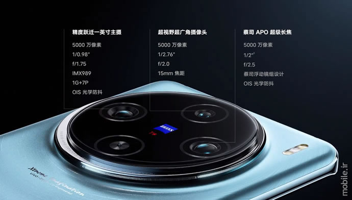 X100 و X100 در دوربین دوم تلهفتو نیز با هم تفاوت دارند و طبیعتاً دست بالاتر در اختیار نسخه پرو است. دوربین تلهفتوی X100 Pro نمونه کاملاً جدیدی با سنسور 50 مگاپیکسلی 1/2 اینچیست که لنز OIS مقابل آن از دیافراگم f/2.5 برخوردار است. نکته جالب توجه در مورد این دوربین به لنز پریسکوپی مقابل آن قرار دارد که بهگفته شرکت سازنده اولین لنز تلهفتوی موبایلی با تأییدیه Zeiss APO بهحساب میآید؛ لنز APO به گونهای از لنزها اطلاق میشود که نسبت به لنزهای عادی از تصحیح اعوجاج رنگی و انحراف کروی بهتری برخوردار است و اصطلاحاً apochromatically corrected نامیده میشود. به بیان سادهتر برخلاف لنزهای عادی که نقطه فوکوس رنگهای اصلی قرمز، سبز و عادی در آنها متفاوت است، در لنزهای APO اختلاف نقطه فوکوس این رنگها به حداقل خود رسیده و در نتیجه وضوح تصویر بهخصوص در لبههای پر کنتراست سوژهها ارتقاء پیدا میکند. لنز پریسکوپی دوربین تلهفتوی X100 Pro از دهانه دیافراگم f/2.5 و فاصله کانونی 100 میلیمتری برخوردار است که 4.3 برابر زوم اپتیکال را ارائه میکند و بزرگنمایی دیجیتال آن نیز به 100 برابر میرسد. از این دوربین برای گرفتن نماهای نزدیک ماکرو نیز میتوان سود جست.
